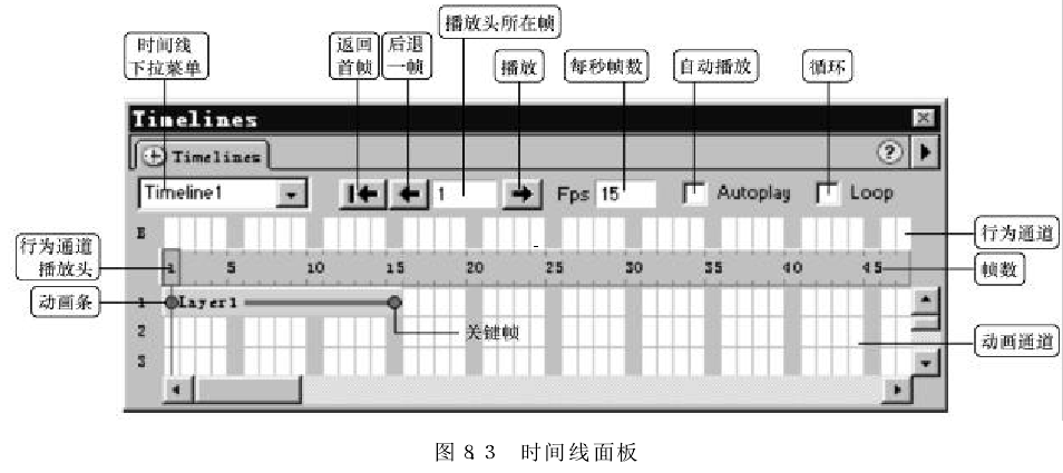 "Timeline(時間線)”面板描繪了層和圖像隨時間變化的屬性。在菜單欄中選擇“Window" →"Time lines" 命令可打開時間線面板。時間線面板所包含的控件如圖所示。