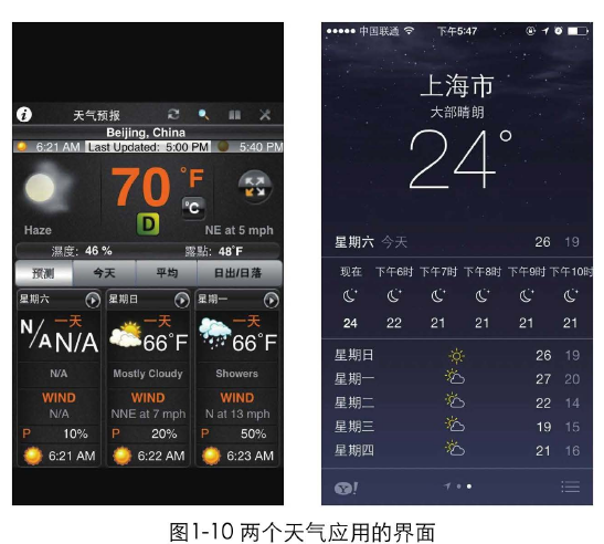 圖1-10是2個(gè)應(yīng)用的界面截圖。同樣是天氣預(yù)報(bào)的應(yīng)用,左邊的界面元素復(fù)雜,內(nèi)容雜亂,用戶很難快速獲取信息,而右邊的界面就清晰很多了。如果設(shè)計(jì)師都能長(zhǎng)期關(guān)注設(shè)計(jì)趨勢(shì)、關(guān)注優(yōu)秀的設(shè)計(jì)是什么樣的,那左邊這樣的設(shè)計(jì)也許慢慢地就不復(fù)存在了。踩著巨人的肩膀,才能看得更遠(yuǎn)。