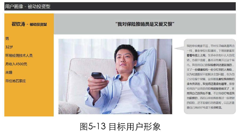 有的產(chǎn)品經(jīng)理和設(shè)計師還會把目標用戶的特征抽象成具體的人物、制作成卡片,貼在自自己的辦公桌上,時刻提醒自己,這才是我的目標用戶,我做需求、設(shè)計決策時要圍繞他來考慮。他的使用場景、使用目標是什么?我們希望他如何使用我們的產(chǎn)品,以實現(xiàn)我們的商業(yè)價值?如圖5-13所示,這是一個虛擬的目標用戶形象。