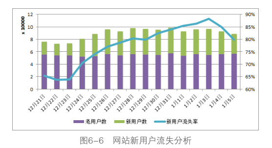 例如,網(wǎng)站的推廣部門有個(gè)需求:網(wǎng)站在年底的圣誕和元旦雙節(jié)日(12月24日到1月3日,為期11天)針對(duì)新用戶做了一個(gè)促銷推廣活動(dòng),活動(dòng)期限內(nèi)新注冊(cè)用戶可以免費(fèi)領(lǐng)取20元的現(xiàn)金抵價(jià)券,在3天有效期內(nèi)購買任意商品時(shí)都可以使用,需要分析這次活動(dòng)為網(wǎng)站用戶數(shù)的增長所帶來的效果。從活動(dòng)的內(nèi)容來看,活動(dòng)的主旨是帶動(dòng)網(wǎng)站新用戶的注冊(cè)和消費(fèi),為網(wǎng)站積累用戶數(shù),既然針對(duì)新用戶,可以對(duì)流失用戶做進(jìn)一步細(xì)分,分析活動(dòng)期間新用戶的流失情況,如圖6-6所示。
