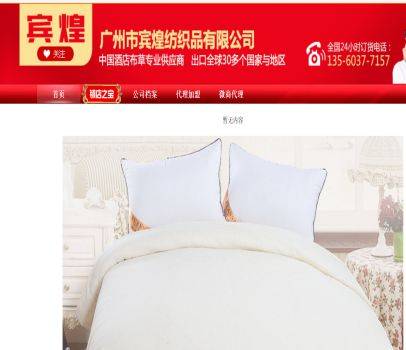 我司在與廣州市賓煌紡織品有限公司合作中;對該公司所經(jīng)營的床上用品這個行業(yè)的網(wǎng)站建設項目積累著豐富經(jīng)驗;同時在該行業(yè)的網(wǎng)站建設、網(wǎng)絡營銷等多元化的床上用品領域中也有很多成功的案例;但愿通過我們的合作,能夠幫助到合作伙伴們在網(wǎng)絡營銷路上平安!順利!發(fā)展!