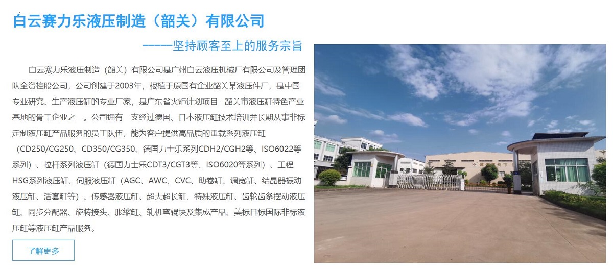 白云賽力樂液壓制造(韶關(guān))有限公司是廣州白云液壓機(jī)械廠有限公司及管理團(tuán)隊(duì)全資控股公司,公司創(chuàng)建于2003年,根植于原國有企業(yè)韶關(guān)某液壓件廠,是中國專業(yè)研究、生產(chǎn)液壓缸的專業(yè)廠家,是廣東省火炬計(jì)劃項(xiàng)目--韶關(guān)市液壓缸特色產(chǎn)業(yè)基地的骨干企業(yè)之一。