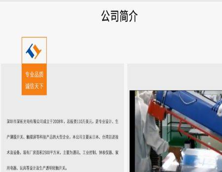 深圳市深拓光電有限公司成立於2008年,總投資110萬美元,是專業(yè)設計、生產(chǎn)薄膜開關、觸摸屏等科技產(chǎn)品的大型企業(yè),本公司主要從日本、臺灣引進技術(shù)及設備,現(xiàn)有廠房面積2500平方米,主要為通訊、工業(yè)控制、儀錶儀器、家用電器、玩具等設計及生產(chǎn)透明輕觸開關。 公司從成立至今,堅定不移地貫徹執(zhí)行品質(zhì)方針,至精至詮、每時每步、不斷改善、追求極限,按照“用戶要求第一、產(chǎn)品品質(zhì)第一、服務品質(zhì)第一、環(huán)環(huán)控制、人人參與、為客戶提供滿意的產(chǎn)品和服務”的經(jīng)營宗旨發(fā)展,並本著“以客戶為本”的經(jīng)營理念和“以人為本”的管理理念,建立出一整套完善的質(zhì)理管理體系。 “一份耕耘,一份收穫”公司通過從領導到普通員工奮力拼搏,到目前為止,月產(chǎn)能力可達2,000平方米,現(xiàn)已成為國內(nèi)外一些大型名優(yōu)企業(yè)的供應商。深拓光電全體員工將秉承公司的一貫宗旨,繼續(xù)精益求精、全心全意為國內(nèi)外客戶提供一流的服務。