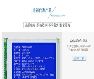 公司產(chǎn)品包括兩大系列:標(biāo)準(zhǔn)品和客戶定制品; 涉及:彩色TFT屏、單色圖形點陣、字符點陣、筆段式;涵蓋TN、HTN、STN、FSTN、TFT等多種模式;融合COG、TAB、COB、SMT等工藝形式。 代表產(chǎn)品5.7英寸320x240圖形點陣液晶屏可直接替代臺灣日本產(chǎn)相應(yīng)產(chǎn)品。