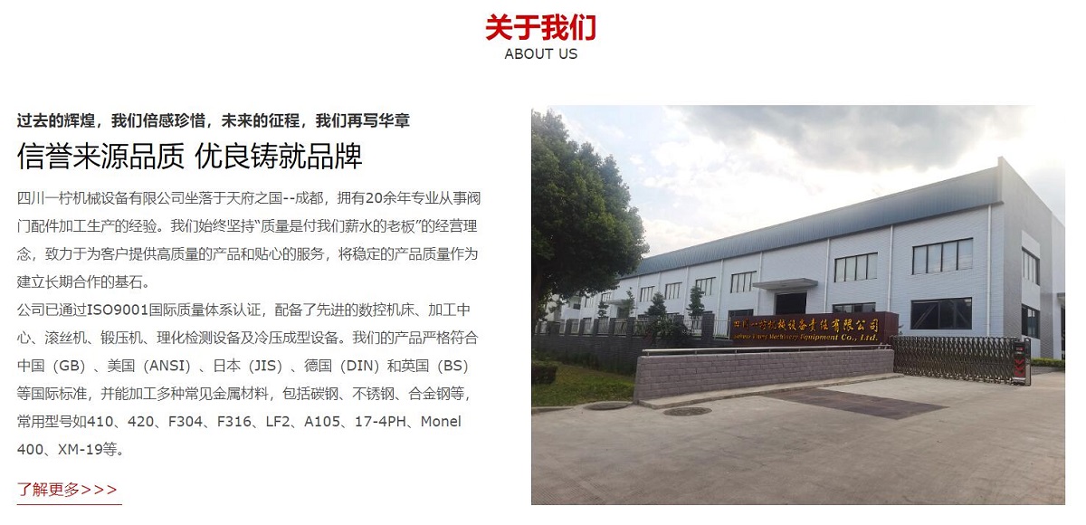 四川一檸機(jī)械設(shè)備有限公司坐落于天府之國(guó)--成都,擁有20余年專業(yè)從事閥門配件加工生產(chǎn)的經(jīng)驗(yàn)。我們始終堅(jiān)持“質(zhì)量是付我們薪水的老板”的經(jīng)營(yíng)理念,致力于為客戶提供高質(zhì)量的產(chǎn)品和貼心的服務(wù),將穩(wěn)定的產(chǎn)品質(zhì)量作為建立長(zhǎng)期合作的基石。