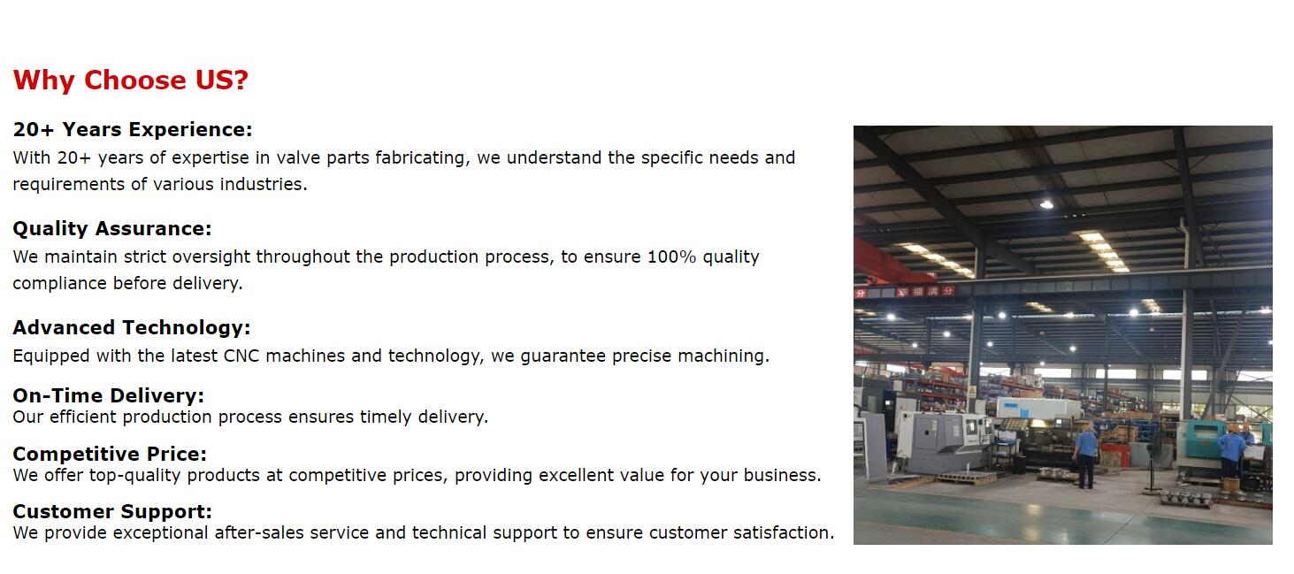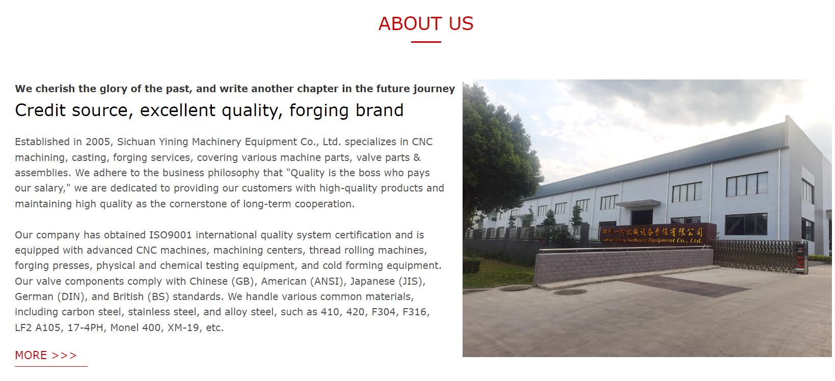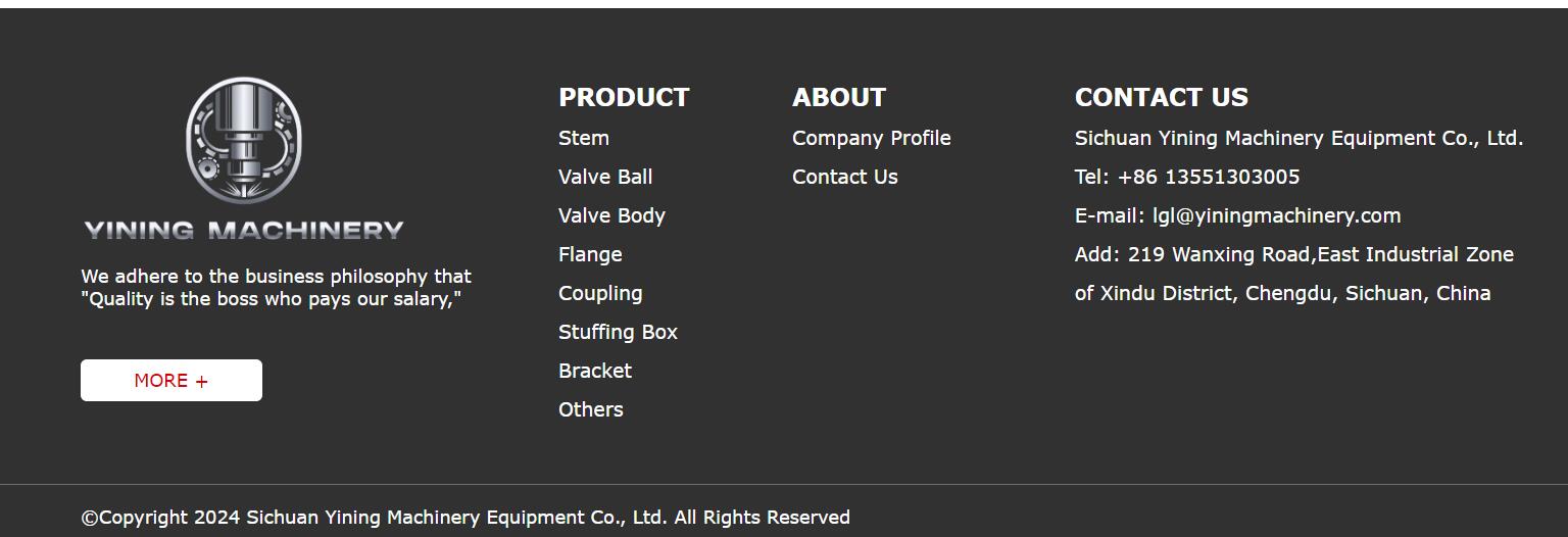 Established in 2005, Sichuan Yining Machinery Equipment Co., Ltd. specializes in CNC machining, casting, forging services, covering various machine parts, valve parts & assemblies. We adhere to the business philosophy that "Quality is the boss who pays our salary," we are dedicated to providing our customers with high-quality products and maintaining high quality as the cornerstone of long-term cooperation. Our company has obtained ISO9001 international quality system certification and is equipped with advanced CNC machines, machining centers, thread rolling machines, forging presses, physical and chemical testing equipment, and cold forming equipment. Our valve components comply with Chinese (GB), American (ANSI), Japanese (JIS), German (DIN), and British (BS) standards. We handle various common materials, including carbon steel, stainless steel, and alloy steel, such as 410, 420, F304, F316, LF2 A105, 17-4PH, Monel 400, XM-19, etc.