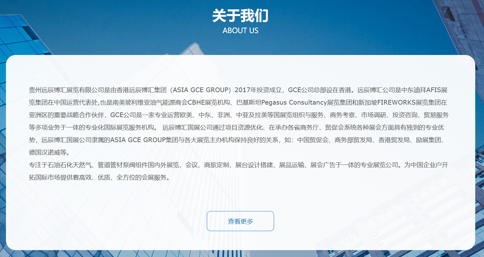 貴州遠辰博匯展覽有限公司是由香港遠辰博匯集團(ASIA GCE GROUP)投資成立,GCE公司總部設在香港。遠辰博匯公司是中東迪拜AFIS展覽集團在中國運營代表處,也是南美玻利維亞油氣能源商會CBHE展覽機構(gòu)、巴基斯坦Pegasus Consultancy展覽集團和新加坡FIREWORKS展覽集團在亞洲區(qū)的重要戰(zhàn)略合作伙伴,GCE公司是一家專業(yè)運營歐美、中東、非洲、中亞及拉美等國展覽組織與服務、商務考察、市場調(diào)研、投資咨詢、貿(mào)易服務等多項業(yè)務于一體的專業(yè)化國際展覽服務機構(gòu)。