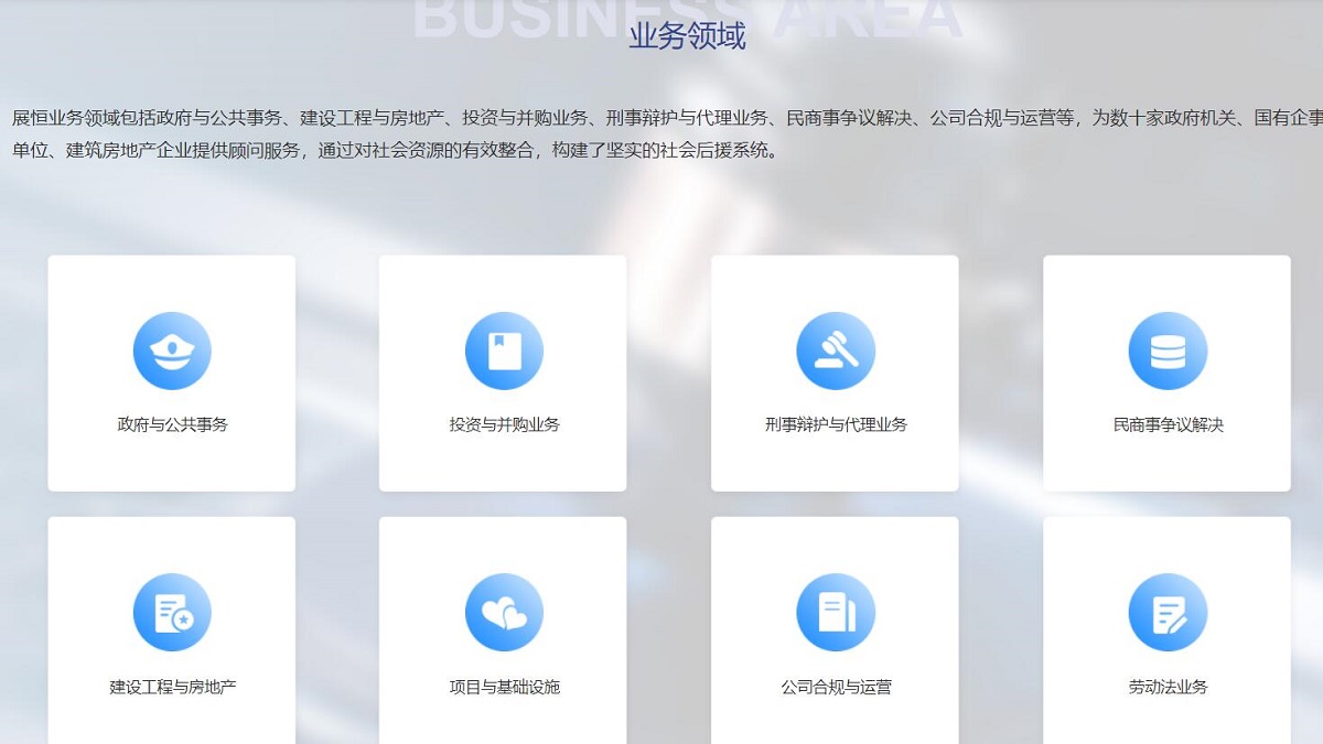 展恒業(yè)務領域包括政府與公共事務、建設工程與房地產、投資與并購業(yè)務、刑事辯護與代理業(yè)務、民商事爭議解決、公司合規(guī)與運營等,為數十家政府機關、國有企事業(yè)單位、建筑房地產企業(yè)提供顧問服務,通過對社會資源的有效整合,構建了堅實的社會后援系統。