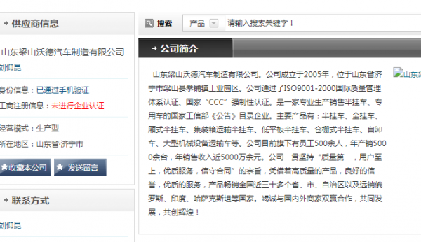 山東梁山*德汽車制造有限公司。公司成立于2005年,位于山東省濟(jì)寧市梁山縣拳鋪鎮(zhèn)工業(yè)園區(qū)。公司通過了ISO9001-2000國際質(zhì)量管理體系認(rèn)證、國家“CCC”強(qiáng)制性認(rèn)證。是一家專業(yè)生產(chǎn)銷售半掛車、專用車的國家工信部《公告》目錄企業(yè)。主要產(chǎn)品有:半掛車、全掛車、廂式半掛車、集裝箱運(yùn)輸半掛車、低平板半掛車、倉柵式半掛車、自卸車、大型機(jī)械設(shè)備運(yùn)輸車等。公司目前旗下有員工500余人,年產(chǎn)銷5000余臺,年銷售收入近5000萬余元。公司一貫堅(jiān)持“質(zhì)量第一,用戶至上,優(yōu)質(zhì)服務(wù),信守合同”的宗旨,憑借著高質(zhì)量的產(chǎn)品,良好的信譽(yù),優(yōu)質(zhì)的服務(wù),產(chǎn)品暢銷全國近三十多個(gè)省、市、自治區(qū)以及遠(yuǎn)銷俄羅斯、印度、哈薩克斯坦等國家。竭誠與國內(nèi)外商家雙贏合作,共同發(fā)展,共創(chuàng)輝煌!