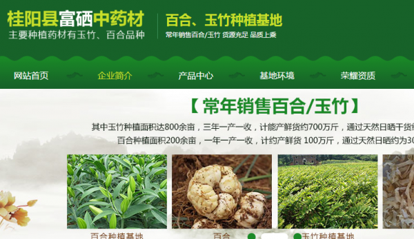 桂陽(yáng)縣富硒中藥材有限公司位于歷史文化悠久、風(fēng)景宜人、 氣候溫潤(rùn)的湖南省桂陽(yáng)縣。公司種植面積達(dá)到1000余畝,主要種植藥材有玉竹、百合品種。其中玉竹種植面積達(dá)800余畝,三年一產(chǎn)一收,計(jì)能產(chǎn)鮮貨約700萬(wàn)斤,通過(guò)天然日曬干貨約有200萬(wàn)斤。百合種植面積200余畝,一年一產(chǎn)一收,計(jì)約產(chǎn)鮮貨 100萬(wàn)斤,通過(guò)天然日曬約為30萬(wàn)斤。 2013年11月被桂陽(yáng)人民政府評(píng)為桂陽(yáng)縣農(nóng)業(yè)產(chǎn)業(yè)化龍頭企業(yè)。桂陽(yáng)縣富硒中藥材有限公司以合作社及家庭模式共存,始終秉承“誠(chéng)信,雙贏,綠色,生態(tài)”的發(fā)展理念。堅(jiān)持以科 技為依托,以市場(chǎng)為導(dǎo)向,產(chǎn)學(xué)研相結(jié)合,按照生態(tài)化、資源化、無(wú)害化的原則進(jìn)行生態(tài)藥材種植和林下生態(tài)養(yǎng)殖,以追求“綠色原生態(tài)”中藥材 為目標(biāo),建成綠色生態(tài)種植和休閑觀光一體,覆蓋研發(fā),種植,加工, 銷售全產(chǎn)業(yè)鏈的藥材公司在經(jīng)營(yíng)上貫徹“人本、誠(chéng)信、為民”的服務(wù)宗旨,奉行“規(guī)范管理、質(zhì)量為上、信譽(yù)至上、共創(chuàng)雙贏”的企業(yè)理念。